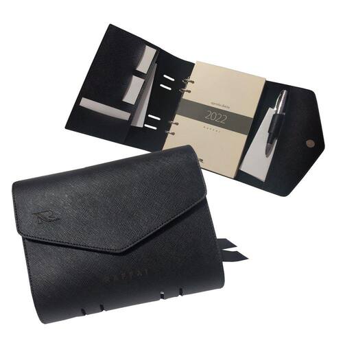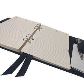 Agenda tipo fichário contendo, dados pessoais, calendários, datas importantes, anotações mensais, planejamento mensal, um dia por página (com exceção dos finais de semana), planejamento para o próximo ano, índice telefônico e lateral com marcações mensais.