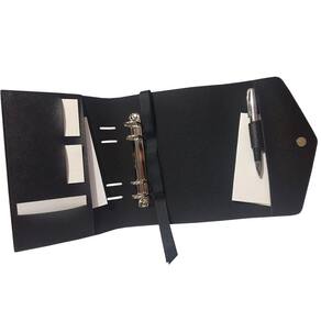 • Contém 2 abas para papéis, 4 porta cartões, 1 porta documentos, 1 bolso com zíper, caneteiro, fechamento por lingueta e botão magnético.