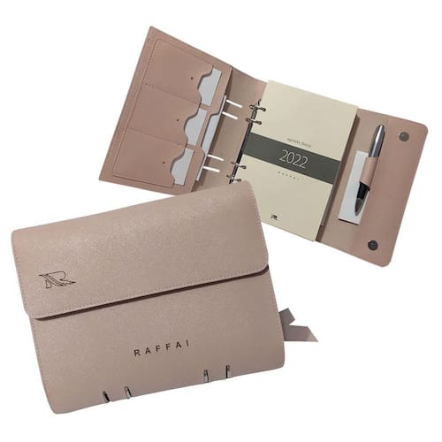 Agenda diária Raffai tipo fichário contendo, dados pessoais, calendários, datas importantes, anotações mensais, planejamento mensal, um dia por página (com exceção dos finais de semana), planejamento para o próximo ano, índice telefônico e lateral com marcações mensais,