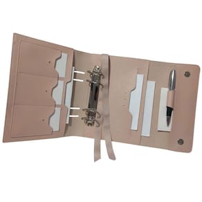 • Medidas 170 x 210 mm fechada, com aba para papéis, três porta cartões, fechamento por dois botões magnéticos e cortes frontais à laser para acomodação da ferragem,
