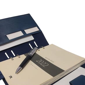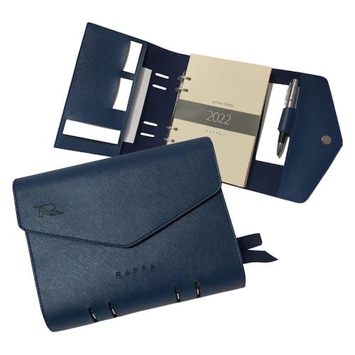 Agenda modelo envelope tipo fichário contendo, dados pessoais, calendários, datas importantes, anotações mensais, planejamento mensal, um dia por página (com exceção dos finais de semana), planejamento para o próximo ano, índice telefônico e lateral com marcações mensais.