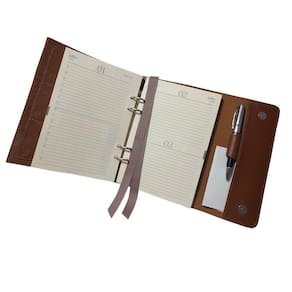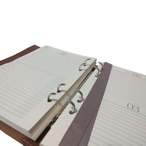 Agenda diária Raffai tipo fichário contendo, dados pessoais, calendários, datas importantes, anotações mensais, planejamento mensal, um dia por página (com exceção dos finais de semana), planejamento para o próximo ano, índice telefônico e lateral com marcações mensais.