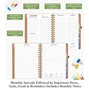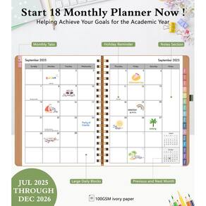 -?Características práticas?Este versátil planejador mensal permite que você maximize a eficiência organizando e planejando seu ano. Nosso calendário mensal 2025-2026 contém páginas de datas importantes para acompanhar aniversários familiares, aniversários ou dias especiais. Visão geral anual, metas anuais, feriados, páginas de conteúdo e senhas, porta-canetas, fecho elástico, bolso interno e mapa do fuso horário dos EUA também estão incluídos para aumentar sua conveniência de planejamento. A inclusão de 18 guias coloridas mensais permite uma navegação rápida e um planejamento fácil durante todo o ano.
