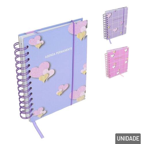 Agenda Permanente 322 FL Espiral Corações C - Agenda permanente com 322 folhas, capa estampada de Corações com detalhes em glitter, ideal para estudantes, profissionais ou qualquer pessoa que valorize organização e estilo, é uma companheira confiável que combina funcionalidade com um toque de charme pessoal.;- Papel off set 60g/m²; Especificações: Marca : FWBTipo de material : PapelCores ou Estampa : Color - não tem como escolher as cores - Será enviado de acordo com a disponibilidade de estoque.Dimensões do Produto : 19 X 15 X 2,5 CMPeso Bruto (Gramas) : 0.307 O que vem na embalagem 1 Agenda Permanente 322 FL Espiral Corações Color