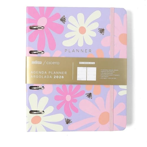 Agenda planner 2026 argolado melissa notas a5 color bloomy Agenda planner 2026 argolado a5 melissa color bloomy A agenda planner argolado 2026 melissa semanal notas a5 color bloomy está de cara nova a dupla semanal agora conta com um design mais limpo e funcional, com os topicos localizados na base da pagina: area destacada para importante, pautas para os objetivos e lista de checagem. Com cheirinho de melissa O miolo semanal notas: -87 folhas em papel pólennatural 80 g/m2 - bolsa pasta com calendário dos anos 2026/2027 e 2028 - 12 divisórias datadas em quatro cores Calendário funcional: Duas duplas para marcações importantes do ano, como aniversários, eventos, datas importantes. Uma visualização anual perfeita em suas mãos. Objetivos: Uma lista com os tópicos: qualidade de vida, pessoal, relacionamento e . Ideal para organizar o corpo e a mente. Planejamento anual: Duas duplas para uma organização do ano, com 3 meses por página. Esta visualização anual é perfeita para um planejamento a longo prazo. Planejamento financeiro: Para um melhor planejamento financeiro do ano, temos uma dupla para escrever entradas, gastos e balanço de cada mês. Visão mensal: No início de cada mês, temos uma dupla com a visão de todos os seus dias, agora acompanhados dos calendários dos meses anterior e posterior. Uma visualização da organização a médio prazo. Checagem + início do mês: Checagem: objetivos conquistados, playlist do mês, ficou para o mês que vem e descobertas Início do mês com área pautada para escrever os planos. Páginas anotações: Ao fim da agenda, temos duplas pontadas para anotações diversas. Ótimo para quem quer escrever um pouco mais. Características: - marca: cícero - modelo: semanal notas a5 2026 melissa color bloomy - medida: 14,8 x 21cm tamanho a5 - capa rígida impressa em policromia - encadernação: argolado - miolo personalizado em 87 folhas, em papel pólen 80g Produto oficial licenciado