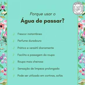 Modo de Usar: Borrife a Água de Passar a uma distância de 20 cm da trama das roupas, deixando-as delicadamente perfumadas.