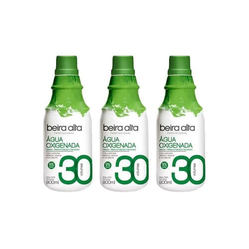 Descrião: Água Oxigenada Beira Alta 30 Volumes 900ml. A Água Oxigenada Beira Alta 30 Vol 9% H2O2 é indicada para tinturas de tons médios. Clareia de 2 a 3 tons, contém Lanolina, emoliente especial para processos químicos, que hidrata, proporciona brilho, evitando o ressecamento dos cabelos.