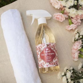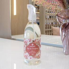 Água perfumada para tecidos Flor de Cerejeira. A fragrância exclusiva, Flor de Cerejeira, com essências importadas, tem notas de flor de cerejeira, lima bergamota e toranja, unidas a um moderno contraste entre notas florais delicadas e um quente e cremoso acorde de vanilla. Com fundo em notas de madeira woody, sândalo, musk e âmbar. Traz paz, amor felicidade e sensualidade.