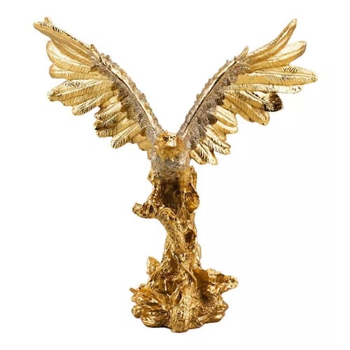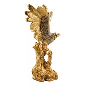 Enfeite decorativo no formato de uma águia em cima de árvore com asas abertas. Águia na cor dourada com 22,5 cm de altura e 21 cm de largura asa até asa. Material: resina