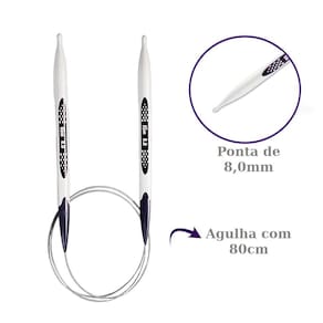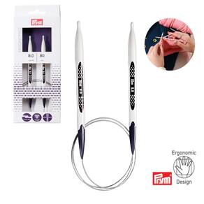 Agulha Circular para Tricô Prym Ergonomics 80cm 8.0mm As Agulhas Circulares Ergonomics para Tricô da Prym tornam o tricô mais fácil, confortável e bonito. As agulhas são feitas de um plástico de alta qualidade e alta performance e são facilmente flexíveis, ou seja, vibram com a malha. São adequadas para iniciantes graças à ponta em forma de lágrima, porque a orientação do fio é muito mais fácil e o fio não escorrega da ponta tão rapidamente.