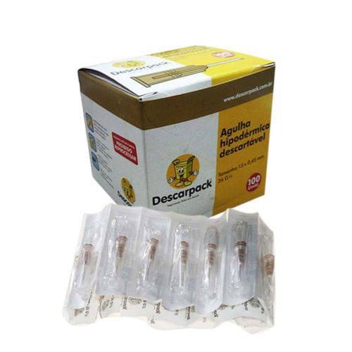 Kit com 5 caixas de 100 unidades = 500 unidades Agulha hipodérmica descartável caixa com 100 unidades Indicada para acesso intramuscular, intravascular, infusão de medicamentos e extração de sangue. Em aço cromo níquel, com protetor de PVC. Atóxica, apirogênica e descartável. Cânula com paredes finas e bisel trifacetado. Canhão em polipropileno com cores padronizadas. Adaptador tipo luer. Embaladas individualmente em papel grau cirúrgico e laminado de polipropileno com abertura em pétala. Esterilizada em O.E. Caixa com 100 unidades. As Agulha Descartáveis Descarpack são fabricadas com polímeros especialmente formulados pra este fim, montadas em máquinas totalmente automatizadas. O canhão permite conexão perfeita nas seringas de bico slip ou lok, apresentam com código de cores universal. Cânula com bisel trifacetado em aço inoxidável, siliconizada, permitindo um deslize suave e perfeito. Esterilização Óxido de Etileno 5 anos. Desenvolvidas para aplicação de soluções em diferentes vias injetáveis de administração: Endovenosa, Intramuscular, Subcutânea e Intradérmica. Estéril, Fabricada em Aço Inoxidável, Possui canhão identificado por código de cores de acordo com a ISO 6009:1992, que permite o acoplamento nas seringas de bico Luer Slip e Luer Lock, Bisel Trifacetado, Lubrificada, Atóxica e Apirogênica, Descartável e de uso único. Tamanho Código Qde. Cartucho Qde. Caixa master 13 x 0,45 0353101 100 unidades 100 cartuchos Ean: 7898283814208