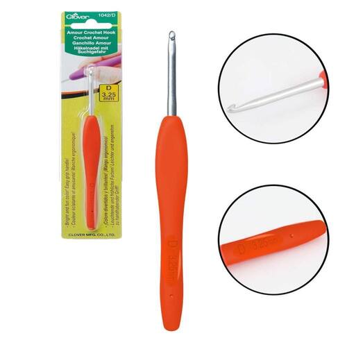 Características: - Marca: Clover - Modelo: Agulha para Crochê - Referência: 1042/D - Cor: Laranja - Ponta de 3.25mm - Corpo emborrachado - Tamanho: 14cm - Composição: alumínio e plástico - Cabo antiderrapante - Design ergonômico e curvado
