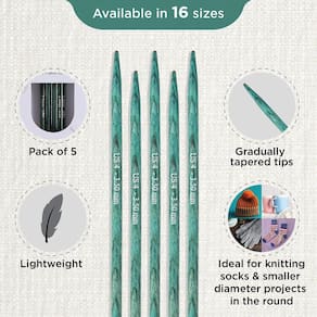 KnitPro As agulhas de ponta dupla Dreamz são agulhas de tricô ideais para iniciantes e tricoteiros experientes. Estas agulhas estão disponíveis em 12,7 cm (16 tamanhos), 15,2 cm (16 tamanhos) e 20,3 cm (14 tamanhos) para acomodar uma variedade de projetos. Estas agulhas são afuniladas em ambas as extremidades para permitir tricô sem costura em círculos em vários estilos. Feitas meticulosamente, essas agulhas garantem uma experiência de tricô suave e sem problemas.