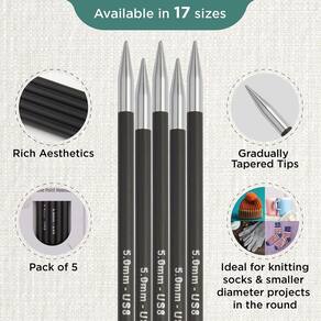 - Estética luxuosa: a cor preta hipnotizante das agulhas e as pontas de latão brilhantes resumem pura elegância e sofisticação. As agulhas KnitPro Karbonz Double Pointed, com seu rico apelo estético, tornam-se uma escolha indispensável entre os tricotadores experientes. As agulhas são um encanto para os olhos e para sua caixa de artesanato.