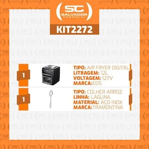 Muito importante:-- conferir produtos no ato do recebimento. Não aceitar produtos com embalagem violada amassado, rasgado, aberto, quebrado, etc , a recusa deve ser feita no ato.Componentes do kit:1 - fritadeira airfryer oven 12l digital premium titanium eaf12t 127v - eos1 - colher para arroz laguna em aço inox - tramontina 63906100conjunto fritadeira air fryer digital eaf12t 127v eos e colher para arroz laguna tramontinadesfrute de uma experiência culinária excepcional com o conjunto fritadeira air fryer digital eaf12t 127v eos, acompanhado pela prática colher para arroz laguna tramontina. Este conjunto combina a mais recente tecnologia da fritadeira air fryer eos com a qualidade reconhecida da tramontina, proporcionando resultados incríveis em sua cozinha. Com a fritadeira digital, você pode preparar pratos saborosos e crocantes com até 80% menos gordura, enquanto a colher para arroz laguna tramontina torna o serviço de suas refeições ainda mais conveniente.90 dias de garantia legal para defeitos de fabricação.Informações técnicas:fritadeira air fryer- painel digital touch: prepare suas receitas com apenas um toque;- 9 funções, em um só produto: a airfryer conta com 9 funções para você preparar qualquer tipo de receita;- porta removível: porta removível, para facilitar a limpeza no seu dia a dia;- tecnologia twist fry: suas receitas prontas em menos tempo. Mais saúde sem utilizar óleo;- 3 em 1: frita sem óleo, assa e desidrata preservando a qualidade do alimento, mantendo o aroma e o sabor;- portátil: leve e prática, possibilita levar para qualquer lugar facilmente.- modelo: eaf12t;- voltagem: 127v;- frequência: 60hz;- cor: titanium;- garantia: 12 meses;- sku salvador comercial: 014049- potência: 1800w;- consumo máximo: 1,8kw/h;- capacidade: 12 litros;- painel: digital touch;- 9 funções pré programadas;- timer ajustável de até 90 min;- temperatura ajustável até 200c;- porta removível para facilitar limpeza.Colher para arroz- linha: laguna- material: aço inox- pode ser lavada em máquinas de lavar louçasdimensões:- fritadeira air fryer: 37,5cm a x 32,5cm l x 34cm p- colher para arroz: 24,8 a x 5,8 l x 2,8 p cmperguntas frequentes:- o produto é novoSim, o produto é novo.- qual é a capacidade desta fritadeiraA capacidade é de 12 litros.- quais são os benefícios de usar uma fritadeira airfryer ovenOs benefícios incluem a capacidade de cozinhar alimentos de maneira mais saudável, com menos gordura, e a conveniência de um controle digital para ajustar as configurações de cozimento.Conjunto, fritadeira air fryer, digital, eaf12t, 127v, eos, colher para arroz, laguna, tramontina, cozinha moderna, fritura sem óleo, preparo saudável, tecnologia digital, refeições práticas, alimentação balanceada, conveniência, facilidade de uso, design funcional, qualidade tramontina, utensílios de cozinha, equipamento de cozinha.