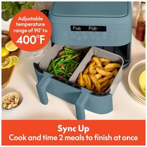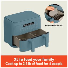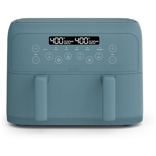 Air Fryer Bella TriZone 3,7L com revestimento cerâmico antiaderente, cesta dupla, controle de temperatura ajustável (32°C a 200°C), botão Sync inteligente e potência de 1700W.Porta-fio