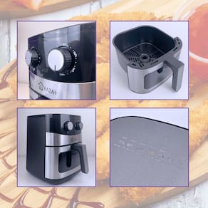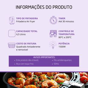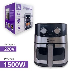Air Fryer Kaza+ 6,5 litros, 1500W, temperatura ajustável de 80°C a 200°C, timer de 30 minutos, desligamento automático, proteção contra superaquecimento, cesto antiaderente e tecnologia para preparo com menos óleo.Porta-fio