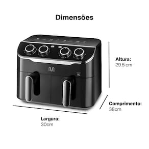 Marca: Multi Modelo: Air Fryer 8L Preta com 2 Gavetas 2500W 220V Multi - GO233 Tensão: 220V Potência: 2500W Capacidade: 8 Litros Timer Sonoro: Até 90 Minutos Gavetas: 2 Independentes Baixo Ruído: Sim Desligamento automático: Sim Controle de Temperatura: Sim Composição do material: PP Dimensões -LxAxC-: 32 x 29 x 39 cm Peso: 7Kg Inmetro: UL-BR 24.0773