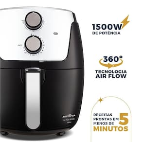 Air Fryer Britânia BFR38 com capacidade de 4,2 litros, 1500W de potência, cesto removível com revestimento antiaderente, timer de 60 minutos, seletor de temperatura de 80 a 200°C e tecnologia Air Flow para cozimento rápido e uniforme.Porta-fio