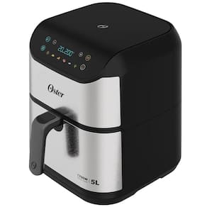 Air Fryer Digital Oster OFRT930 com capacidade de 5 litros, design em aço inox, painel digital com funções pré-programadas, timer de 60 minutos e temperatura ajustável de 80°C a 200°C.Porta-fio