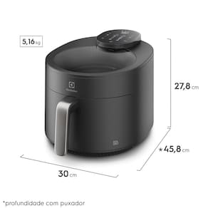 Com uma capacidade total de 5,1 litros, a Air Fryer Electrolux é perfeita para preparar porções generosas para toda a família, com até 90% menos gordura e 50% menos calorias, sem abrir mão do sabor e da textura de frito.