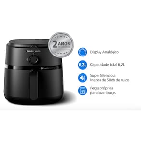 Air Fryer com capacidade de 6L, 1700W de potência, timer de até 60 minutos, temperatura ajustável de 80 a 200 graus e tecnologia Rapid Air para preparo com pouco ou nenhum óleo.Porta-fio