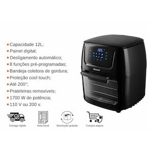 Especificações: - Marca: Amvox; - Modelo: ARF1222; - Capacidade de até 12 litros; - Painel digital com desligamento automático e 8 funções pré-programadas; - 1700W potência turbo cyclo; - Prateleiras removíveis; - Porta Transparente; - Função Air Fryer, Forno e Desidrata; - Função de Proteção para aumento excessivo de temperatura; - Estrutura com proteção cool touch; - Sistema rápido de circulação de ar 360º; - Base antiderrapante; - Ajuste de temperatura manual de 70 a 200 graus C; - Bandeja coletora de gordura, 2 assadeiras removíveis; - Garantia: 12 meses.