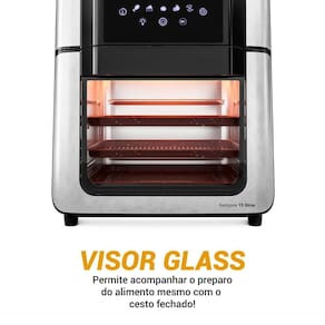 Frita com pouquíssimo ou nenhum óleo; 2 em 1: Fritadeira e forno; Seletor de temperatura de 80 a 200C; Timer de 90 minutos; Capacidade do cesto 5,5L; Capacidade total 15L; Função Desidratar com tempo e temperatura ajustável; Painel Digital com 10 funções pré-programadas; Acabamento em inox; Base antiderrapante; Proteção contra superaquecimento; Luz Interna; Porta Removível.Porta-fio