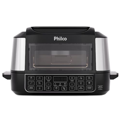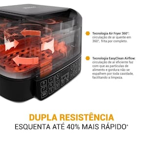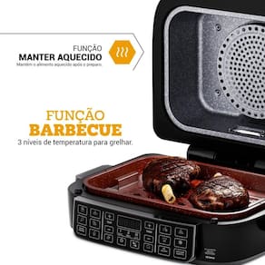 Painel digital com 15 funções pré-programadas; Função Barbecue com 3 pontos de grelhar; Resistência dupla (1800W superior + 1000W inferior); Revestimento antiaderente Redstone; Temperatura ajustável de 50°C a 205°C; Timer de até 120 minutos; Desligamento automático; Funções desidratar e descongelar; Refratário versátil; Acessórios podem ser levados a lava-louças; Trava de segurança; Sistema de proteção contra sobreaquecimento; Base antiderrapante.Porta-fio