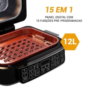 Painel digital com 15 funções pré-programadas; Função Barbecue com 3 pontos de grelhar; Resistência dupla (1800W superior + 1000W inferior); Revestimento antiaderente Redstone; Temperatura ajustável de 50°C a 205°C; Timer de até 120 minutos; Desligamento automático; Funções desidratar e descongelar; Refratário versátil; Acessórios podem ser levados a lava-louças; Trava de segurança; Sistema de proteção contra sobreaquecimento; Base antiderrapante.Porta-fio