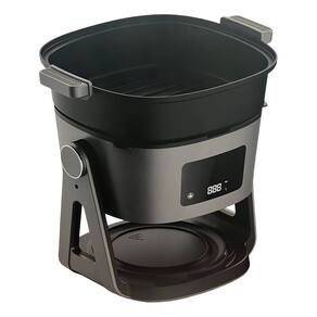 Função 2 em 1: fritadeira e panela/grelha. Capacidade de 5 litros. Potência de 1500W. Cesto em vidro borossilicato com visão 360°. Função rotativa para uso como grelha. Preparo rápido e uniforme.Porta-fio