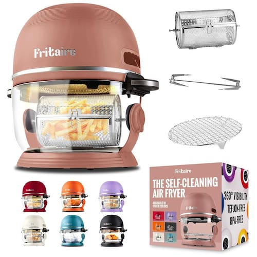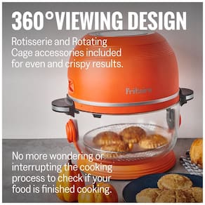 Aproveite a conveniência de monitorar o progresso dos seus alimentos sem interromper o processo de cozimento com a nossa fritadeira de ar de vidro. Equipada com um aquecedor de 1500 W e sistema de convecção de vórtice, garante refeições consistentemente crocantes e uniformemente cozidas todas as vezes. Ideal para quem busca uma fritadeira de ar de fácil limpeza, basta encher a tigela de vidro com água e sabão e deixar o modo de autolimpeza fazer o trabalho para você. A Fritaire oferece 6 modos de cozimento versáteis, desde bifes suculentos até batatas fritas crocantes, incluindo um espeto giratório feito de aço cromado seguro para alimentos, uma grelha de aço inoxidável e um cesto giratório para batatas fritas feito de aço inoxidável, todos laváveis na máquina de lavar louça. Funciona em tomadas padrão dos EUA 110 -115 V com motor de espeto giratório alimentado por quatro pilhas 4 AAA. Fique tranquilo sabendo que nossa tigela de vidro é livre de BPA, teflon e ftalatos, proporcionando uma alternativa de cozinha mais saudável, perfeita para pessoas preocupadas com a saúde que buscam uma fritadeira atóxica ou sem teflon.