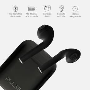 Marca: Pulse Modelo: Airbud TWS Pulse Star Preto - PH420 Cor: Preto Formato do Fone: Auricular Alcance: 10 metros Resposta em frequência: 20Hz a 20kHz Sensibilidade: 90 5 Duração máxima da bateria: 4 horas Bateria: Polímero 300 mAh Tempo de recarga da base: 2 horas Conexão do fone: TWS Versão Bluetooth: 5.1 Com cancelamento de ruído: Não Tipo de Som: Estéreo Conteúdo da embalagem: 2x Fones de ouvido TWS Airbud 1 Base para recarga e suporte dos fones 1 Cabo tipo C 1 Guia rápido Dimensões -LxAxC-: 10.1 x 19.9 x 3.5 cm Peso: 0.08Kg Garantia: 3 anos Certificado Anatel: 06837-19-03111