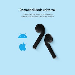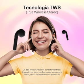 Tecnologia TWS -True Wireless Stereo- Os dois fones Airbuds se conectam entre si, transmitindo som nos dois canais, esquerdo e direito, sem a necessidade de nenhum fio.