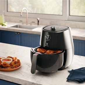 Air Fryer Electrolux 3,2L Preta Efficient 1400W por Rita Lobo (EAF10)->> Como funciona o Controle de Temperatura Intuitivo? -O Controle de Temperatura Intuitivo permite que você selecione a temperatura de forma simples, garantindo que seus alimentos sejam preparados sempre na temperatura correta, proporcionando refeições deliciosas.->> Como a AirFryer reduz calorias e gordura? -Com até 90% menos gordura e quase 50% a menos de calorias¹, a AirFryer Electrolux proporciona uma culinária saudável. Testes realizados demonstraram uma redução significativa de calorias e gordura em comparação com métodos tradicionais de fritura.->> O que o Timer Sonoro oferece? -O Timer Sonoro permite que você selecione o tempo de preparo de forma simples, oferecendo praticidade para realizar outras tarefas enquanto a AirFryer trabalha. Um aviso sonoro indica quando sua refeição está pronta.->> Como é a limpeza da AirFryer Electrolux? -A limpeza é fácil graças ao cesto removível e antiaderente. Basta retirar o cesto e limpá-lo, proporcionando praticidade e facilidade no cuidado com o aparelho.->> Quais são as vantagens das Receitas Pré-Programadas? -As Receitas Pré-Programadas oferecem praticidade, com temperaturas e tempos de preparo já definidos. Prepare pratos conhecidos com a segurança de um resultado perfeito.->> Como funciona o Indicador Luminoso de Funcionamento? -O indicador luminoso informa quando a AirFryer está em funcionamento, proporcionando mais segurança durante o uso.->> O que é o Desligamento Automático? -Passado o tempo pré-definido no timer, a AirFryer desliga automaticamente, garantindo que seus alimentos não passem do ponto, proporcionando praticidade e evitando preocupações.->> Qual a Capacidade e Potência da AirFryer Electrolux? -Com uma capacidade de 3,2L e potência de 1400W, nossa AirFryer oferece o tamanho ideal e maior potência para preparar suas receitas de maneira rápida e saudável.->> Quais são as opções de Tensão Elétrica disponíveis? -A AirFryer está disponível em 127V ou 220V, proporcionando flexibilidade para se adequar à sua instalação elétrica.->> Como é a segurança durante o uso da AirFryer Electrolux? -Além do desligamento automático, a AirFryer é projetada com foco na segurança, proporcionando tranquilidade durante o preparo de suas refeições.->> A AirFryer Electrolux é fácil de usar? -Sim, com controles intuitivos e funções pré-programadas, a AirFryer é fácil de usar, permitindo que você desfrute de refeições saudáveis sem complicações.->> Posso encontrar receitas específicas para a AirFryer Electrolux? -Sim, a AirFryer Electrolux é compatível com uma variedade de receitas saudáveis. Consulte o manual do usuário para sugestões ou explore suas próprias criações culinárias.->> Qual é a vida útil esperada da AirFryer Electrolux? -Com manutenção adequada e uso conforme as instruções, a AirFryer Electrolux foi projetada para oferecer durabilidade e desempenho a longo prazo.Ficha Técnica - Air Fryer Electrolux 3,2L Preta Efficient 1400W por Rita Lobo (EAF10)->> Modelo: EAF10->> Tensão Elétrica (V): Disponível em 127V ou 220V->> Capacidade: 3,2L->> Potência (W): 1400->> Peso do Produto: 5,5 kg->> Dimensões do Produto: -Altura: 33,7 cm -Largura: 29 cm -Profundidade: 39,4 cm->> Peso do Produto Embalado: 6,0 kg->> Dimensões do Produto Embalado: -Altura: 37,3 cm -Largura: 32,3 cm -Profundidade: 32,3 cm->> Frequência: 60 Hz->> EAN-13: 7896347181624