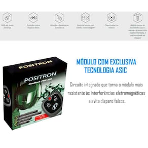 - Módulo com sensor de movimento integrado (exclusividade Pósitron): dispara a sirene em caso de movimentação da motocicleta em qualquer direção (ignição desligada e alarme ligado);