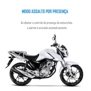 - Controle por presença: ao afastar o controle de presença da motocicleta, o alarme é acionado automaticamente. A sirene irá disparar, as setas piscarão e o motor de partida será bloqueado (o tempo para o disparo é programável);