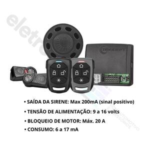 Alarme • Tensão de Alimentação: 9 a 16 Volts • Consumo: 6 a 17 mA • Bloqueio de Motor: Máx. 20 A • Saídas de Setas 2 x 70W c/ proteção digital • Saídas de Trava, Destrava, Auxiliar 1 E 2: Máx. 200 mA - (Sinal Negativo) • Saída Auxiliar 3 e Controle de Som: Máximo 200 mA - (Sinal Positivo) • Dimensão Embalagem: 140 x 100 x 65 mm • Peso Embalagem: 0,35 Kg