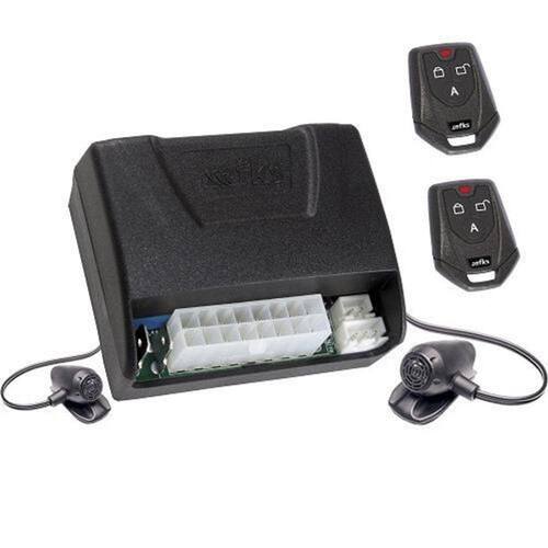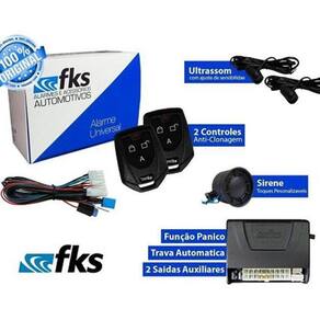 Alarme Automotivo Universal com Ultrasom FK902 Plus Este é o alarme para seu carro Acompanham 2 controles - Comando de travas negativo; - Travamento automático de portas; - Bloqueio do motor; - Desliga Rádio; - Auxiliar 1 - Sobe vidro Inclusive das marcas FIAT e VW-G5 com vidros automatizados, subida e descida original de fábrica. - Auxiliar 2 - Desce vidro ou abre o porta-malas; - Sensor de ultrassom com ajuste de sensibilidade; - Funções programáveis: Seleção de tempo de travamento, seleção do tom da sirene, arme automático, rearme automático, cancelamento de ultrassom. - Outras funções: pânico, localizador e check control. Sirene dedicada. Ficha técnica - Cor: preto - Marca: Fks