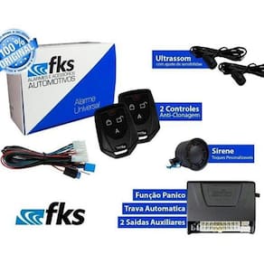 Alarme Automotivo Universal com Ultrasom FK902 PlusEste é o alarme para seu carroAcompanham 2 controles- Comando de travas negativo;- Travamento automático de portas;- Bloqueio do motor;- Desliga Rádio;- Auxiliar 1 - Sobe vidroInclusive das marcas FIAT e VW-G5 com vidros automatizados, subida e descida original de fábrica.- Auxiliar 2 - Desce vidro ou abre o porta-malas;- Sensor de ultrassom com ajuste de sensibilidade;- Funções programáveis:Seleção de tempo de travamento, seleção do tom da sirene, arme automático, rearme automático, cancelamento de ultrassom.- Outras funções: pânico, localizador e check control.Sirene dedicada.Ficha técnica- Cor: preto- Marca: Fks