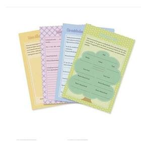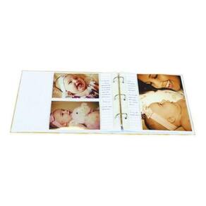 Sistema de encadernação com ferragem. Aceita refil. Capa dura impressa com laminação fosca. Caixa em polipropileno impressa, combinando com a capa. 4 folhas impressas frente e verso para o histórico do bebê, com envelopes plásticos para proteção. Folhas em plástico texturizado branco.