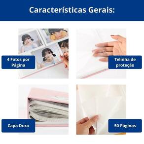 - espaço para até 200 fotos: Com 50 páginas de alta qualidade, o álbum oferece espaço amplo para fotos 6,5x9cm sejam elas fotos instantaneas ou qualquer foto que possua essas medidas.