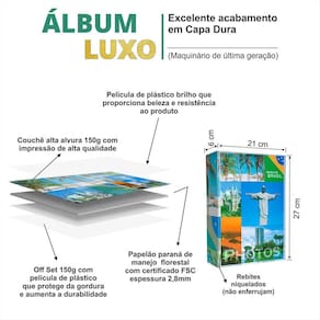 Album de papelao parana duro embalado em papelcouche impresso e plastificado brilho. Parte interna com 50 folhas plásticas de polipropileno com furos para ferragem de 3 argolas para 200 fotos 10x15 Comprimento : 520 mm aberto 220mm fechado Largura : 80 mm Altura : 270 mm