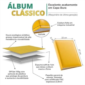 Álbum de fotos para guardar e proteger suas recordações. Os albuns de couro costurados possuiem capas macias e almofadas, isso porque ela e costurada de couro sintetico e preenchida com espuma internamente. Produto de qualidade e durabilidade, fabricada com os melhores materias do mercado. O sistema de ferragem permite a inclusão de mais folhas para ampliar o numero de fotos. Tem capacidade para até 500 fotos 10x15 4 fotos por pagina Ou250 fotos 15x21 2 fotos por pagina comprando refil de 15x21 Possui memo central para descrição das suas fotos Plastico de polipropileno transparente que protege as fotos. Nunca use pvc