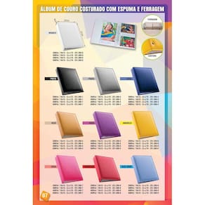 Album de papelao parana duro costurada com couro sintético e preenchida com espuma internamente. Parte interna com 125 folhas plásticas de polipropileno com furos para ferragem de 3 argolas para 300 fotos 10x15 Comprimento : 520 mm aberto 220mm fechado Largura : 80 mm Altura : 270 mm