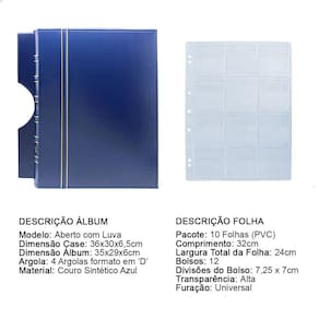 O fichário é produzido em capa sintética com cantoneiras para proteção, material de alta qualidade para armazenar com segurança e de forma organizada sua coleção, ele é muito resistente confeccionado com 4 argolas em formato ‘D’ em aço inoxidável reforçado, permitindo o encaixe da folha de até 32x24cm, processo de fabricação artesanal permitindo um excelente acabamento. O Álbum acompanha case de proteção (Luva) para maior proteção e durabilidade do material.