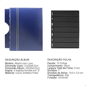 O fichário é produzido em capa sintética com cantoneiras para proteção, material de alta qualidade para armazenar com segurança e de forma organizada sua coleção, ele é muito resistente confeccionado com 3 argolas em formato ‘D’ em aço inoxidável reforçado, permitindo o encaixe da folha de até 28x21cm, processo de fabricação artesanal permitindo um excelente acabamento. O Álbum acompanha case de proteção (Luva) para maior proteção e durabilidade do material.