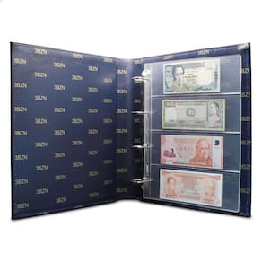 O Álbum de Luxo Azul 10 Folhas para 40 Cédulas 3BZN G é um kit de fichário que acompanha folhas para cédulas em acetato tamanho 32x24cm, a transparência da folha é alta e cristalina, de forma que é possível ver sua cédula sem interferências, e de ambos os lados: frente e verso, dessa forma é possível apreciar sua coleção da melhor forma. Esse kit de folhas é feito em um material resistente sendo o principal organizador de cédulas colecionáveis para colecionador.