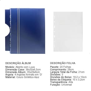 O Álbum de Luxo Azul 20 Folhas para 60 Cédulas 3BZN G é um kit de fichário que acompanha folhas para cédulas em acetato tamanho 32x24cm, a transparência da folha é alta e cristalina, de forma que é possível ver sua cédula sem interferências, e de ambos os lados: frente e verso, dessa forma é possível apreciar sua coleção da melhor forma. Esse kit de folhas é feito em um material resistente sendo o principal organizador de cédulas colecionáveis para colecionador.
