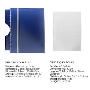 O Álbum de Luxo Azul 40 Folhas para 40 Cédulas 3BZN G é um kit de fichário que acompanha folhas para cédulas em acetato tamanho 32x24cm, a transparência da folha é alta e cristalina, de forma que é possível ver sua cédula sem interferências, e de ambos os lados: frente e verso, dessa forma é possível apreciar sua coleção da melhor forma. Esse kit de folhas é feito em um material resistente sendo o principal organizador de cédulas colecionáveis para colecionador.